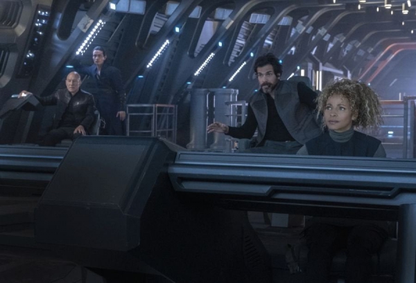 Op het derde beeld de vermoedelijke bemanning waarmee Picard de ruimte in reist. We zien naast hem ook Evan Evagora als Elnor, Santiago Cabrera als Rios en Michelle Hurd als Raffi.